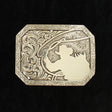 This rectangle Nocona mens western buckle is silver with a stamped edge and western scrolling on one side and a roping cowboy on the other side.
