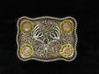 This large scalloped buckle features a buck skull and shotgun shells atop a swirled filigree background. Twisted rope trim. Measures 3-3/4 wide by 2-3/4 tall.