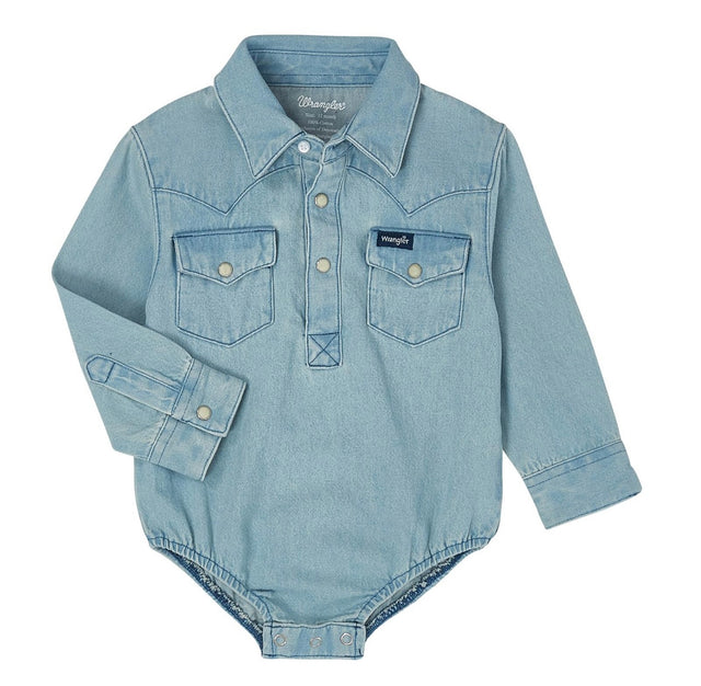 Wrangler Denim Onesie - 0-3m is backordered and will ship as soon as it is back in stock.